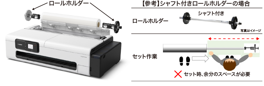 省スペースでロール紙のセットができるようシャフト(長い軸)のないロールホルダーを採用。ロール紙の左右から装着してプリンターにセットするので、シャフトのあるロールホルダーに比べ、余分なスペースを必要としません。