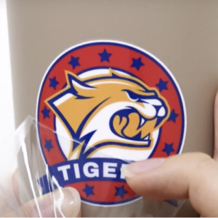UV-DTFプリンターは、転写フィルムにカラーインク層、次に白色インク層を紫外線硬化インクで印刷。そして、印刷面を保護するためにトップコート層を重ねます。印刷された転写フィルムを対象物に貼り付け、圧力を加えてしっかりと密着させます。その後、保護フィルムを剥がすと、デザインが対象物に転写されます。
