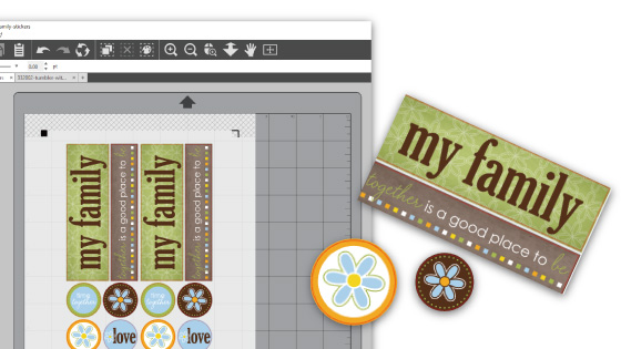 カットしたいデザインにトンボ(位置合わせマーク)を設定し、お手持ちのプリンターで印刷。CAMEOに印刷したメディアをセットしたらトンボセンサーでトンボ位置を読み取り、トンボを基準に印刷の輪郭などをキレイにカットします。ラベルやシール、POPなど様々な用途に使えます。